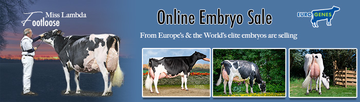 6 mars 2026 A brand new edition of the Eurogenes Online Embryo Sale has been launched through the SALE SITE. There is something for everybody with for example: Female Blondin Detective (+16 Conf.) embryos out of Kings-Ransom Park Darker VG-88-USA 2yr., she is the maternal sister to Kings-Ransom Dropbox @ Semex, Female Eskdale Mountie-Red embryos out of Golden-Oaks Ambrosia-Red VG-89-NL EX-91-MS 4yr., her Ranger-Red daughter won last week the Intermediate Champion and Grand Champion title at the Wintershow Noord-Holland 2026. Female Blondin Detective (+16 Conf.) embryos out of Ms Lambda Fizz VG-86-USA 2yr., the Delta-Lambda daughter straight out of the Res. Grand Champion World Dairy Expo 2024 and multiple herdbuilding packages starting at 75 EUR / embryo. Click further for the complete offering.    En Lire Plus