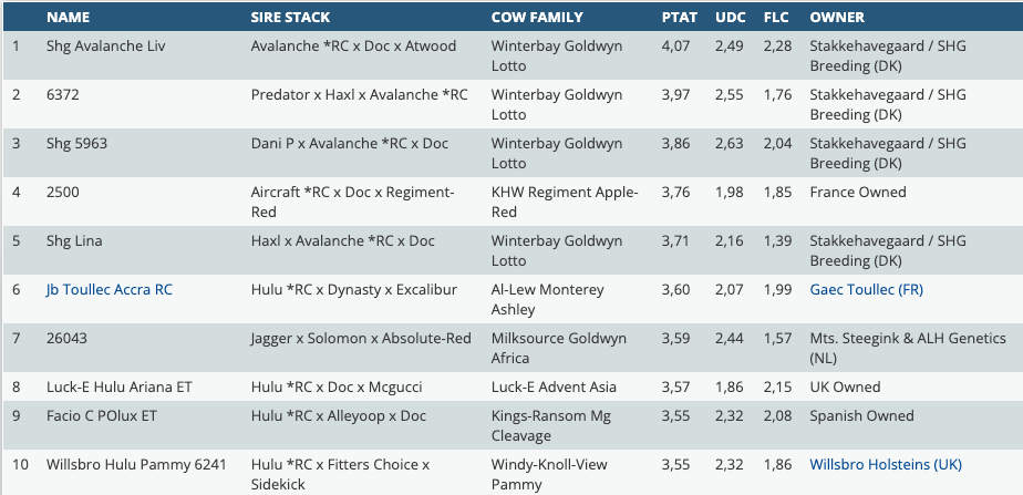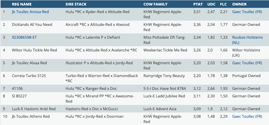 An index round brings us also new chart toppers in the R&W and RED CARRIER PTAT rankings. Today it's time for these great rakings of the dominating females in Europe. The influence of the APPLE's is again huge with delivering several offsprings at the paternal sires and maternal line. With +3.51 PTAT is JB Toullec Anissa Red still the Nr. 1 Red & White female in Europe and goes back on KHW Regiment Apple-Red EX-96-USA. In second follows an Aircraft *RC daughter from Germany at +3.36 PTAT. A great debut for Roubos Hulu Tiara-Red, a Hulu *RC granddaughter to Miss Pottsdale Dfi Tang-Red EX-94-USA at +3.34 PTAT. Topping the RED CARRIER PTAT ranking is again SHG Avalanche Liv *RC at +4.07 PTAT from the Winterbay Goldwyn Lotto EX-95 family. She is followed by her daughters, sired by Predator and Dani P at the 2nd and a 3rd spot with +3.97 PTAT and +3.86 PTAT.
