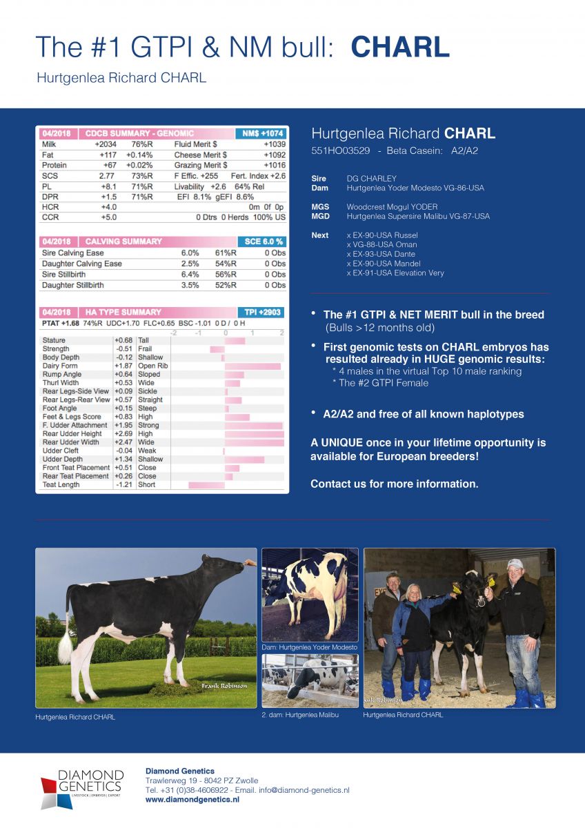 Hurtgenlea Richard CHARL is the World's highest GTPI & Net Merit bull of bulls older then 12 months: GTPI +2903 and 1074 $ Net Merit, more than 50 Net Merit points higher than the #2 in this ranking! CHARL has a unique index with >2000 Milk / +117 Fat / +67 Protein, combined with incredible fitness traits (SCS 2.77 / PL +8.1 / DPR +1.5 / SCE 6.0) and +1.70 UDC in his type profile! CHARL is also A2/A2 and is free of all known haplotypes! There is a UNIQUE opportunity available for European breeders to use CHARL genetics to your breeding program. Contact us today!