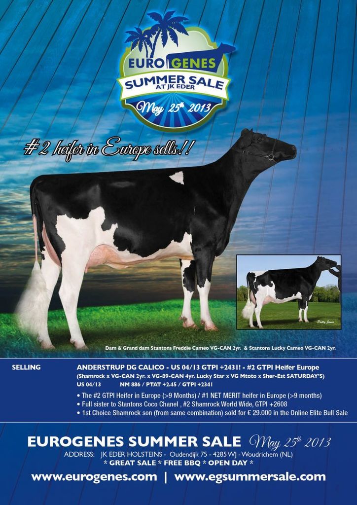 One of the great stars in the Eurogenes Summer Sale (May the 25th 2013, the Netherlands) is Anderstrup DG Calico, the #1 Net Merit and #2 GTPI heifer in Europe (Flush age: > 9 months) with $ 886 NET MERIT and +2431 GTPI! She is the full sister to Stantons Coco Chanel, the #2 Shamrock in the breed with GTPI +2608 and a 1st Choice BULL from the same combination sold for € 29.000 in the Online Elite Bull Sale.