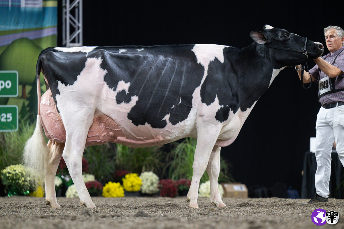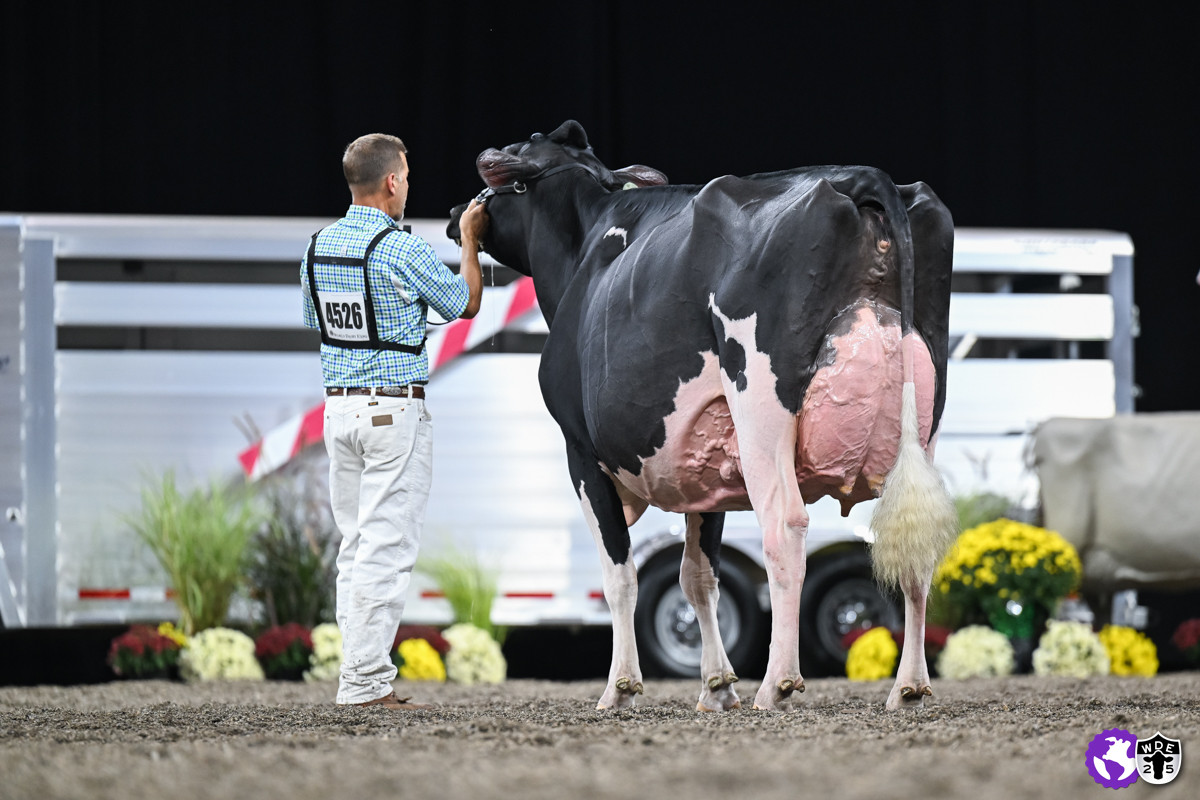Exactly 10 years ago, Lovhill Goldwyn Katrysha EX-96-USA won the Grand Championship at the World Dairy Expo 2015! Last weekend, a close relative of Katrysha EX-96 won the Grand Champion title after having already won the Senior Champion title earlier that day. Her name is Lovhill Sidekick Kandy Cane EX-96, she is sired by Sidekick from a GP-83 2yr. Diamondback *RC from Lovehill Gold Karat EX-93-CAN 3E (s. Gold Chip). Karat EX-93 is the maternal sister to Lovhill Goldwyn Katrysha EX-96, who won multiple titles more, like All-American Aged Cow 2015 & Res. Grand Champion Royal Winter Fair 2014 & World Dairy Expo 2014. The Reserve Grand Champion title went to West-Adub Lambda Sadie, she is sired by the Premier Sire of the Holstein show this year, Farnear Delta-Lambda. The Honorable Mention Grand Champion title went to Eixdale Pwrup Alongside (s. Alongside)