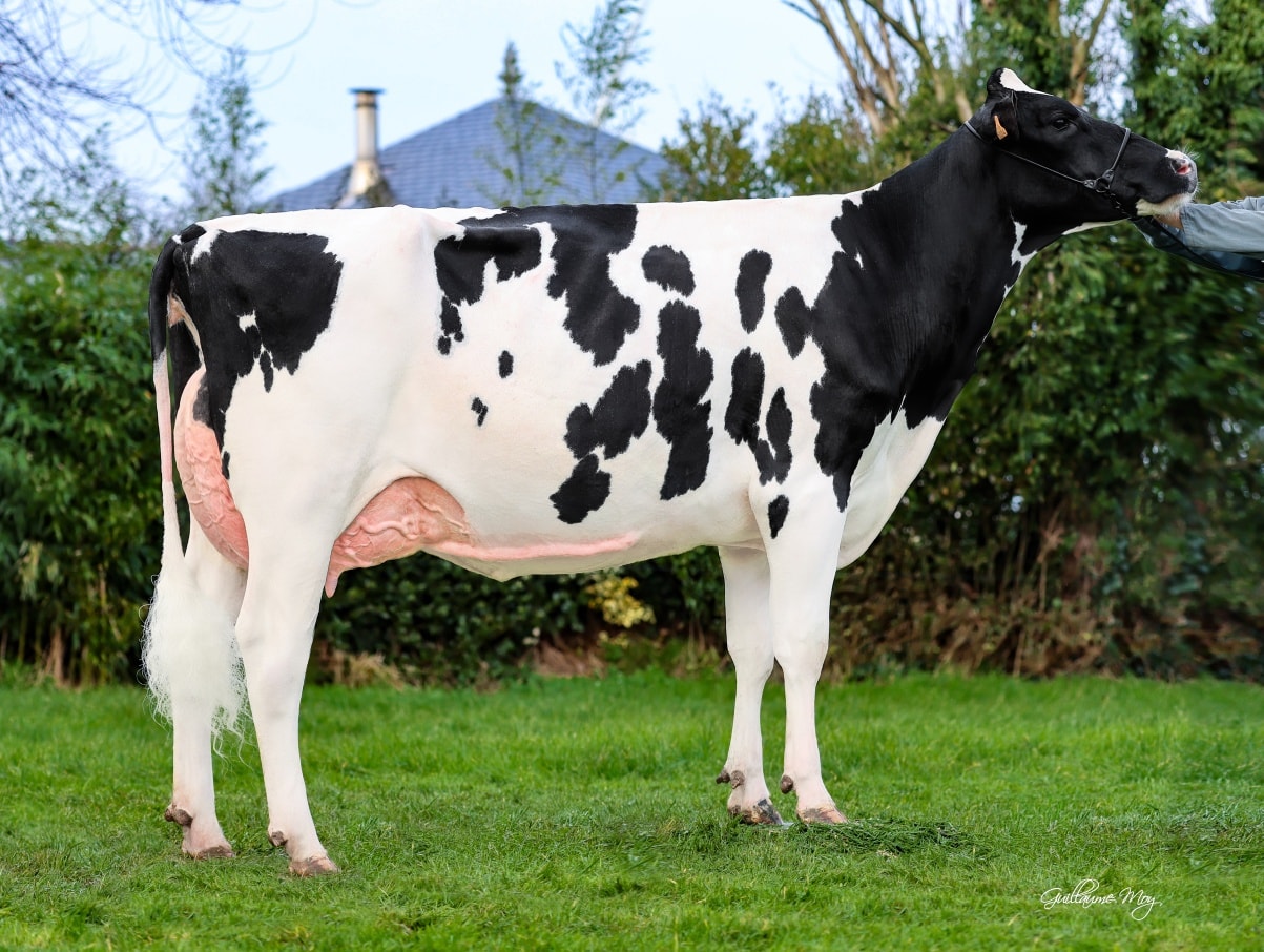 She belongs to one of the promising cows in Europe: Capj Teana *RC VG-86-FR 2yr. This Koepon OH Ryder daughter produced in her 1st lactation in 305 days 10.295kgM and traces back to the 2x French Cow of the Year: Amarante EX-FR. This family delivered many interesting and successful cows, with for example Carf Emeraude EX-91-NL, she was 2yr. old Champion National Show France, Le Mans (FR) & Noordeloos (NL), Intermediate Champion Marienwaerdt 2013 and Dutch Cow of the Year 2022. This line of the Emeraudes delivered also JK DG Esmeralda EX-92-NL EX-94-MS (Res. Champion 2yr. Old National HHH Show '16, Champion 2yr. Old Dairy Fair Mariënwaerdt '16 & Res. Champion 2yr. Old Hoornaar '16), JK DG Carmen 5 EX-92-NL EX-93-MS (Senior Champion, Udder Champion & Grand Champion Opmeer 2025, Intermediate Champion & Grand Champion Wintershow Middenmeer 2024, 1st, Best Udder and Reserve 2yr. old Champion National HHH-Show '22 and more).