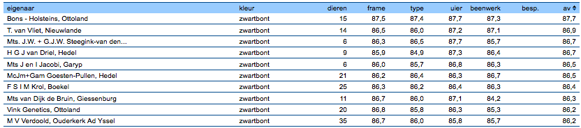 Bons Holsteins has the leading position for the 4th year in a row for average classification on the 2yr. olds in the Netherlands, 15 2yr. olds averaged VG-87,7! Giessen Holsteins (from Theo van Vliet) are on the 2nd place in this list with VG-86,9! Click further for the complete ranking and more information.
