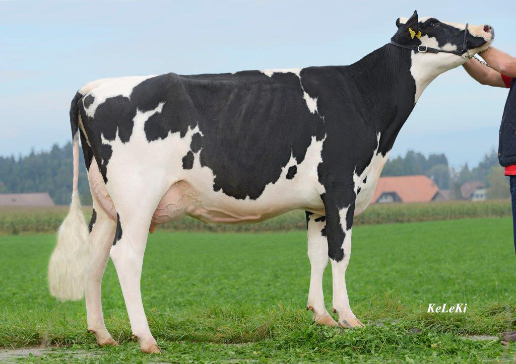 Moo Goldwyn Diamond EX-92-CH is one of the successful show cows form the Giessen Cinderella branch out of the Roxy-family. Multiple sons of Diamond already left to AI like Hokovit Best @ World Wide Sires Germany who recently has become a daughter proven sire and Hokovit Win, the #2 Windbrook son in Switzerland. Diamond her first daughter by Bolton is fresh and has been pictured. Hokovit Bolton Sharon, bred by Hokovit Genetics already delivered high sons like Frauchwil Smarakt (s. Supersire) who is the #7 ISEL Genomic bull in Switzerland and is also dam to the #3 ISEL Heifer in Switzerland, Frauchwil Supersire Shakira.