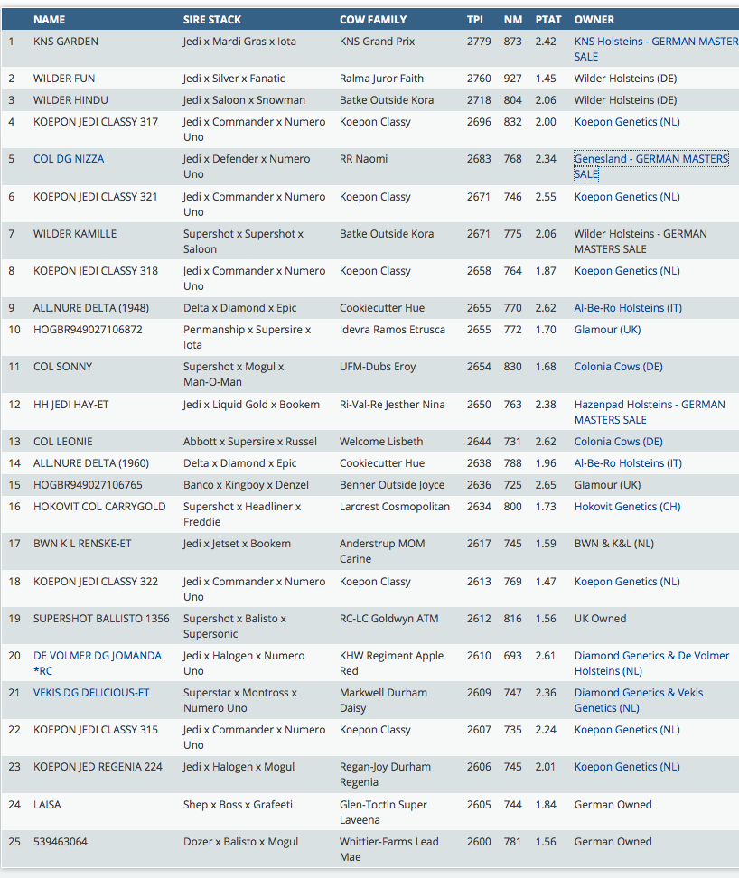 KNS GARDEN is the #1 GTPI heifer of the European GTPI October 2016 run, GTPI 2779 is her official index which makes her the #5 GTPI heifer in Europe, she will sell in the German Masters Sale! 4 heifers out of the Top 12 from this run are heifers selling in the German Masters Sale 2016! Click further for the complete ranking.