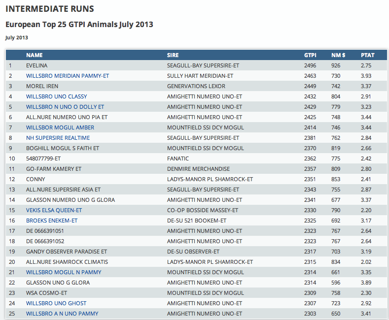 An amazing July index run for Willsbro Holsteins UK with no less than 7 heifers in the top 25 GTPI! Willsbro Meridian Pammy-ET places second with +2463 GTPI. She is a Meridian-daughter from the very successful Windy-Knoll-View Promis EX-95-USA GMD DOM cow family. Click further for the complete European Top 25 GTPI Animals of July!