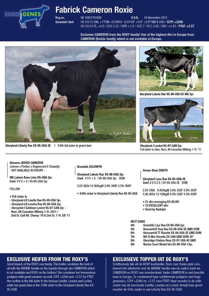 The newest addition to the Eurogenes Online Heifer Sale is the exclusive dtr of Sheema Jeeves Cameron (From the Barbie family and not available in Europe), Fabrick Cameron Roxie with GTPI +2266 / PTAT +3.57! Barbie on the topside and one of the greatest branches of the Roxy's on the bottom! The Online Heifer Sale starts on Wednesday March the 13th.