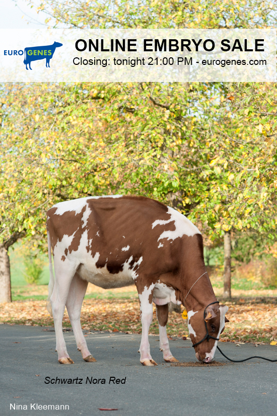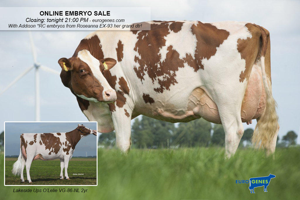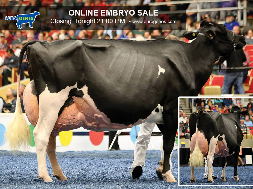 Today it's the final day of the Eurogenes Online Embryo Sale. The Sale ends tonight at 21:00 PM (Dutch Time). Assure yourself now of the speciale packages selling! For example: GOLDWYN embryos from the Katrysha's, the finest of the Dellia's, FEMALE embryos from the type sensatian Crushtime of Oceanie EX-94 her daughter and more!