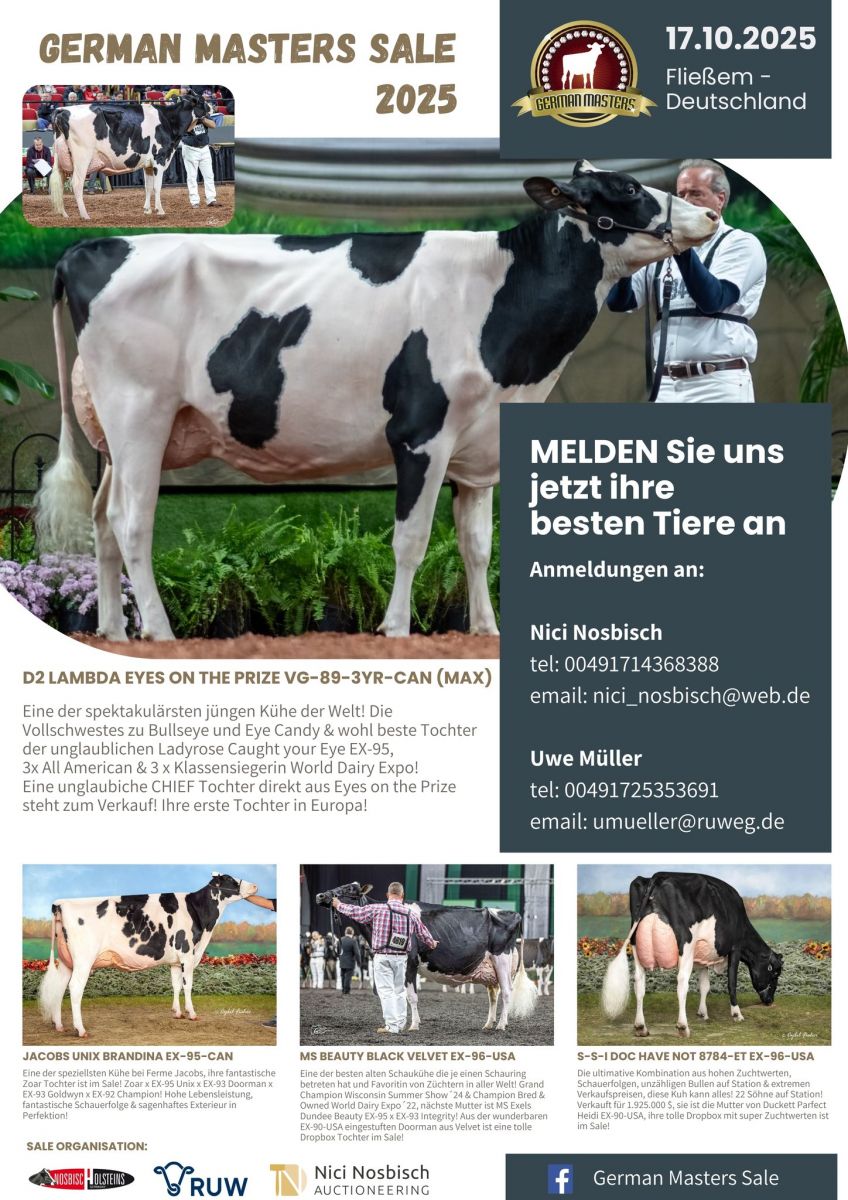 One of the greatest LIVE sales on the European auction agenda will take place on Friday, the 17th of October 2025: the 12th edition of the German Masters Sale. The list of consignments is extraordinary with for example the R&W Altitude grand daughter to the 2x Supreme Champion World Dairy Expo: Erbacres Snapple Shakira EX-97-CAN, Blondin RD Unstopabull Maple Red EX-94, Supreme Champion Royal Winter Fair 2022 and Intermediate Champion World Dairy Expo 2022 her Diamondback *RC daughter sells or Hilrose Advent Anna Red EX-95, Wisconsin Cow of the Year, multiple All-American and over 164.493kg Milk Lifetime Production!! From her EX-91 Altitude daughter sells a R&W Hulu in the German Masters Sale! CONSIGN your very best as soon as possible for the German Masters Sale 2025, as a LIVE SALE back at the RUW Regionalzentrum in Fließem, Germany!