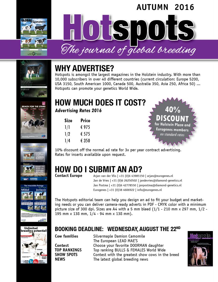 The Hotspots Autumn '16 edition will arrive in September '16 and offers a great advertising possibilities for breeders and AI's around the globe! You can place an advert already for EUR 210 and advertise to a huge group of >10.000 subscribers from >40 different countries! This issue contains cow family articles (the European branch of the Lead Mae's & the Silvermaple Camomile's), a contest for the favorite Doorman dtr, top ranking lists, show cow contests and more! Click further for more information.