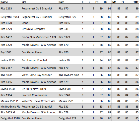The well known Sanchez daughter Willem’s-Hoeve Rita 579 EX-91-NL, had 3 Atwood daughters in classification that day. They averaged 86 points for their total score, highest of them was Willem’s-Hoeve Rita 1457 with VG-87. Most of all the 2yr olds that were classified that day were out of different branches from the Rita family.