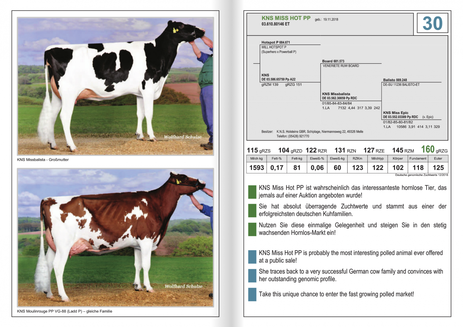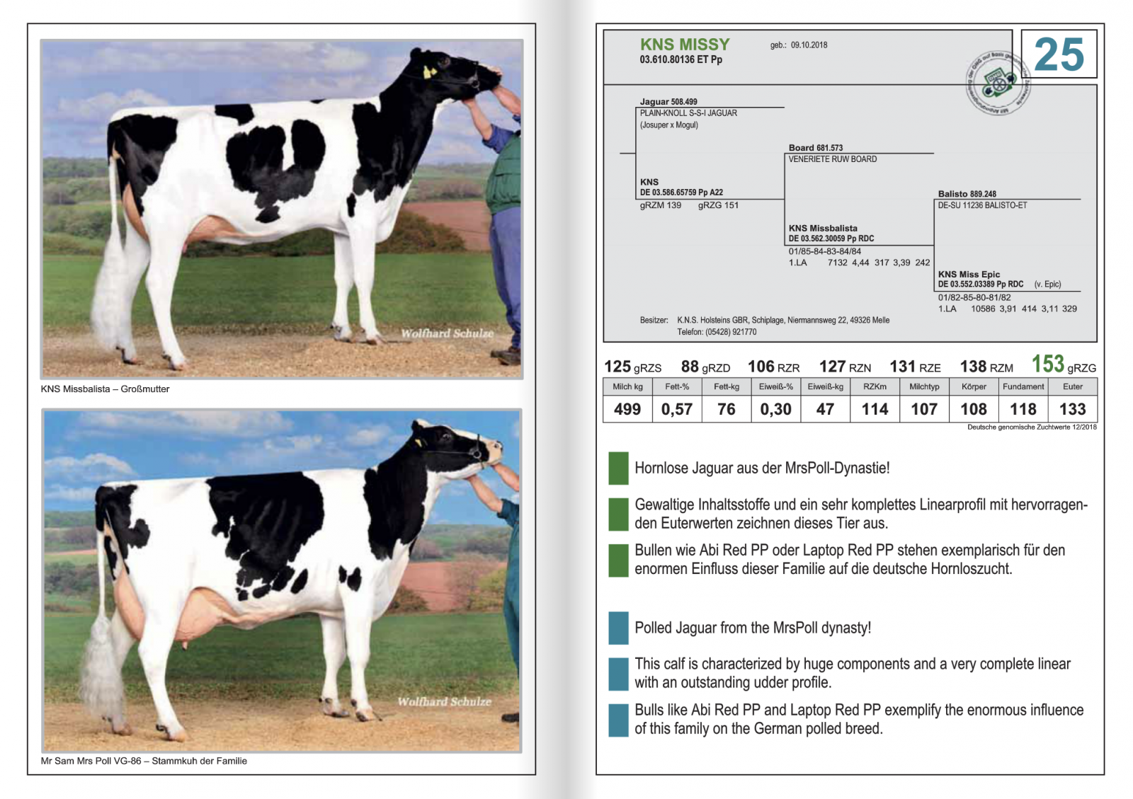 Tommorow the Schwarzbunttage in Osnabrück will be held. During this SHOW there is also an auction with exclusieve heifers & cows: the TOP Genetic Sale. KNS Holsteins has offered some of their very best: two POLLED heifers with huge indexes. KNS Missy is a POLLED Jaguar dtr with +153 RZG from the same family as the popular bulls Abi Red PP & Laptop Red PP. The other heifer they consigned is KNS Miss Hot PP a Hotspot P dtr with the giant RZG of +160 RZG & she is POLLED to.