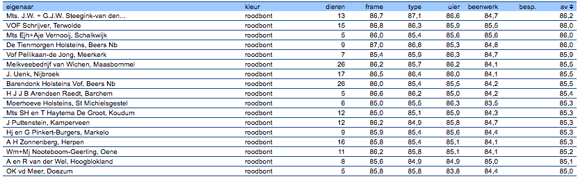 Top ranking average herd classification score R&W, The Netherlands 2017