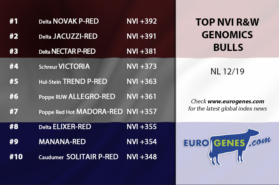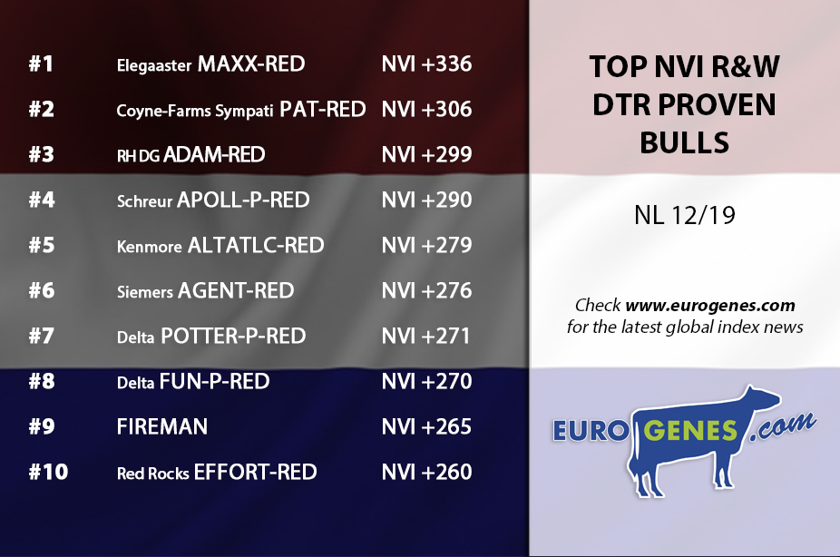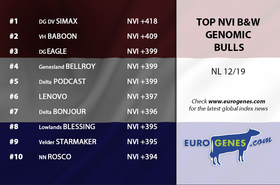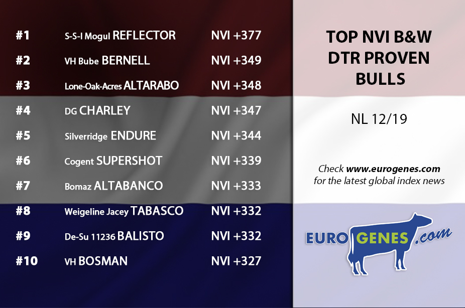 Today it's time for the Dutch indexes based on NVI. The new #1 B&W genomic sire is DG DV SIMAX with testing +418 NVI in the second place we find VH Baboon with +409 NVI followed by DG Eagle with +399 NVI in third. The topping B&W daughter proven sire is this December 2019 run: S-S-I Mogul REFLECTOR with +377 NVI well ahead of the second one VH Bube BERNELL with +349 NVI. ALTARABO follows in third with +348 NVI and DG Charley with +347 NVI at place 4. Delta NOVAK P-RED kicks Delta Jacuzzi-Red (now +391 NVI) off the throne with testing +392 NVI. The number one daughter proven R&W sire is again Elegaaster MAXX-RED with +336 NVI. Coyne-Farms Sympatic PAT-RED follows in second with +306 NVI. RH DG ADAM-RED makes the stage complete with +299 NVI at place 3.