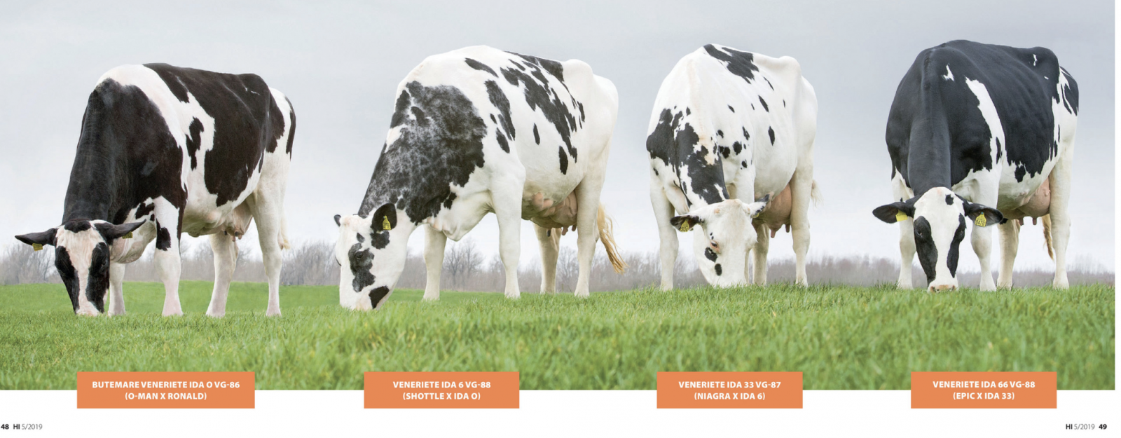 In the newest HI May issue is an interesting article written about the family of Butemare Veneriete Ida O VG-86. This family is the foundation of the heavily used Boss son Veneriete Board! Pictured are four generations Ida's, an impressive photo with representative cows who shows us a lot of strenght, dairy and capacity. The youngest one of these four generations Ida's is Veneriete Ida 66 VG-88-NL, the dam to BOARD @ RUW. From Board was recently a progeney group showed at the HighlightSale in Hamm, Germany. The Ida's a family to remember!!