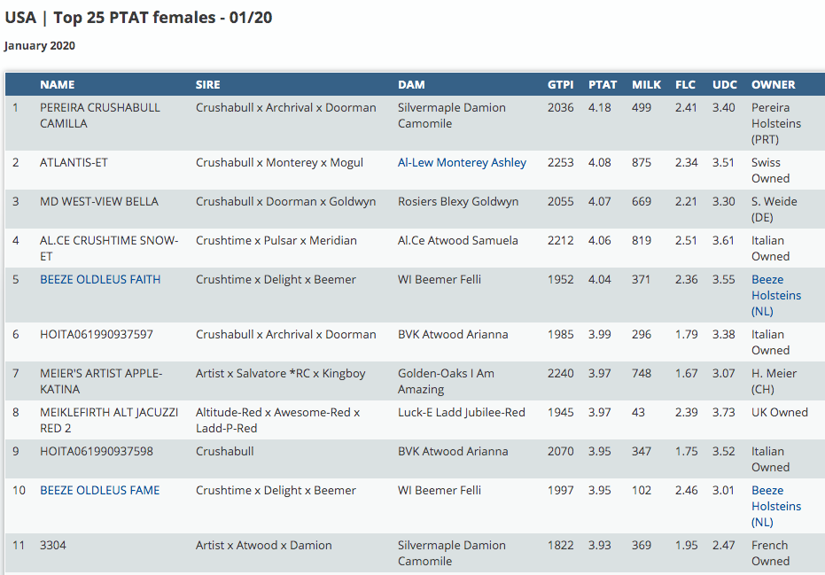 The January intermediate run based on the American GTPI index is online available now!! Topping the GTPI list is Positive daughter Cristella Relax ET with no less than +2926 GTPI. She is followed by Go-Farm Bondida with +2892 GTPI in a unique combination with +3.40 PTAT!! Furthermore in the top 5 we find All.Nure DJ Doris ET 3221 with +2849 GTPI and +975 Net Merit, a Discjockey daughter from the Gil Balisto Loulou family. The #1 PTAT female is Pereira Crushabull Camilla with +4.18 PTAT and backed by Silvermaple Damion Camomile. Second in the list is Al-Lew Monterey Ashley VG-89-USA EX-MS La1. her Crushabull daughter Atlantis-ET with +4.08 PTAT. Also the very first Crushtime daughters are testing high with six daughters in the top 25!!