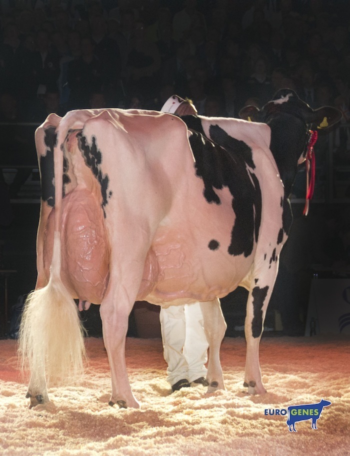 Decrausaz O-Kalibra, the European Champion of 2013 and owned by GS Alliance and Pat Conroy has increased her score up to EX-96-SW! Kalibra is the 2nd Swiss cow ever to score EX-96 in Switzerland! In 2013 she won Grand at the Swiss Expo and the European Championship! Last week her 1st Choice Armani dtr sold for $ 46.500 at an American sale. Kalibra is a Red Carrier Boss Iron dtr from the Canadian Cloverlands Cherry cow family.