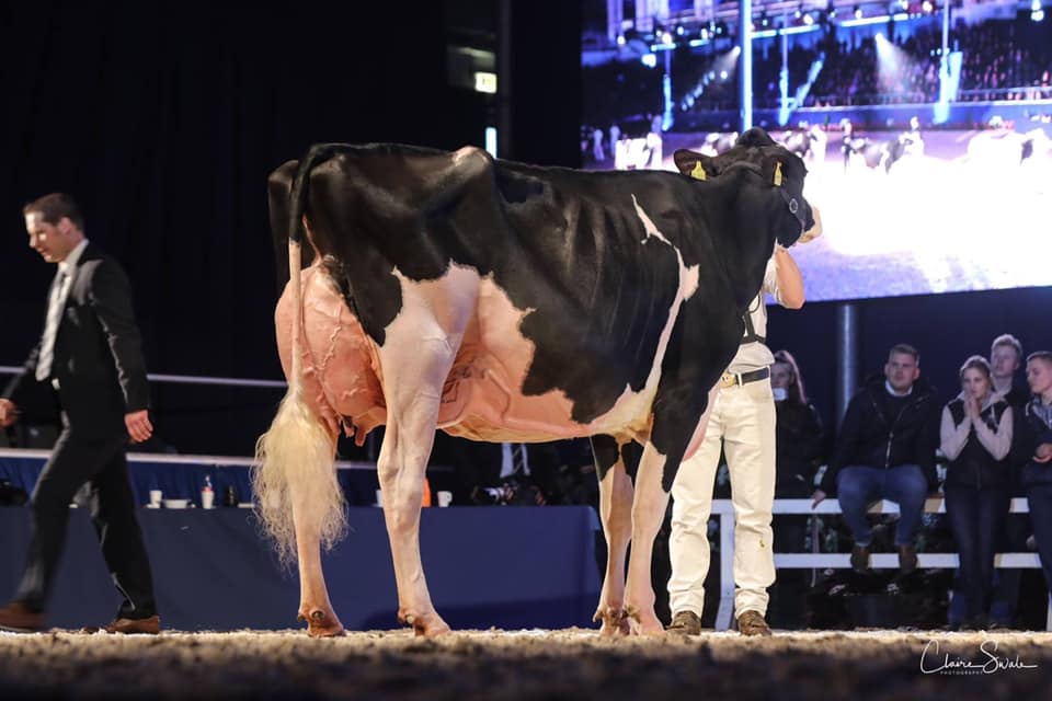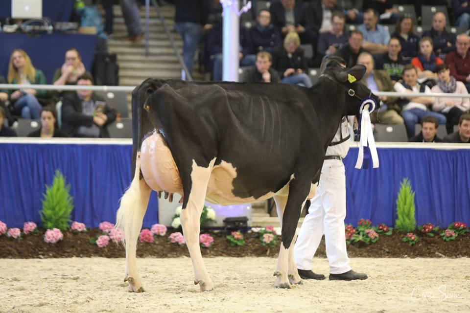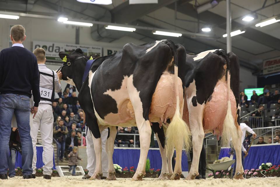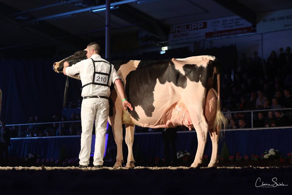 Yesterday the overwhelming Schau der Besten became a NEW Grand Champoin: Loh TJ Alessja (s. Armani *RC). This 2nd calver Armani daughter was last year the 2-Yr Old Champion of the Schau der Besten and won this year from Lady Gaga, who became Res. Grand Champion. Alessja is a daughter of Luck-E Redburst Aphrodite VG-87-NL, this family traces back to Luck-E Advent Atlanta EX-94-USA, an Advent-Red daughter from the heart of the Luck-E families. She is from the same family as the popular R&W type sires: Awesome-Red & Adonis-Red. The 2-Yr Old Champion of the show was won by WFD Miss Diamond a Diamondback *RC daughter in ownership of Wille, Rübesam, Melbaum & Kallass.