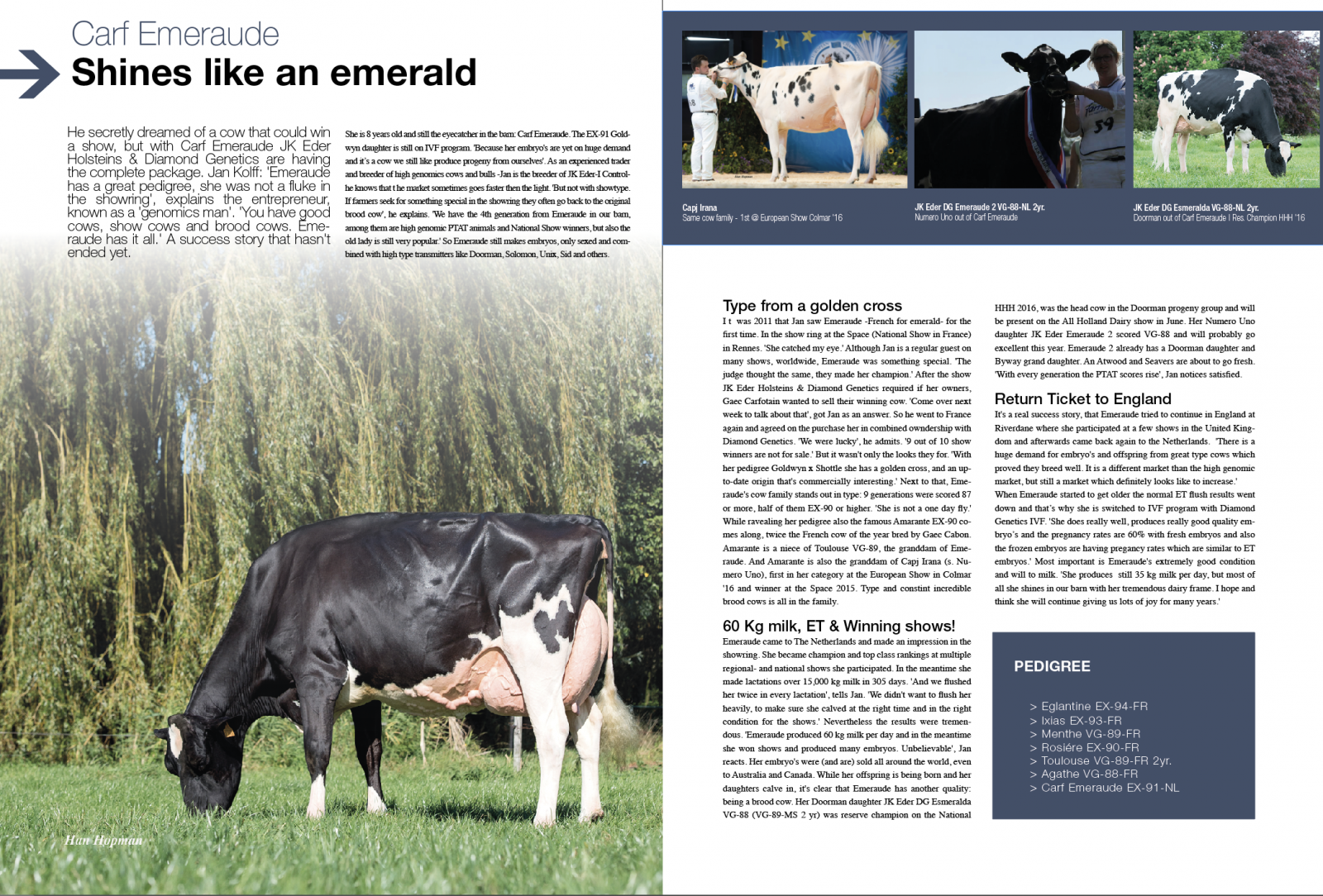 A family which is getting hotter and hotter, the family of Carf Emeraude EX-91 who is still alive and looking in her best shape! She won National Show titles, she is 8 years old and her daughters and her legacy goes on with her daughters and grand daughters which were winning titles at the National Shows and having high PTAT indexes. 2 cows from the family were classified this week at JK Eder Holsteins: Emeraude's Doorman daughter JK Eder DG Esmeralda received the maximum score of VG-89-NL VG-89-MS 3yr. (she is going to show on the 1st of July on the NRM 2017), another Doorman (grand daughter of Emeraude: JK Eder DG Elisa scored VG-87-NL VG-88-MS 2yr. Click further for more info, pictures and an article about the Emeraude cow family!