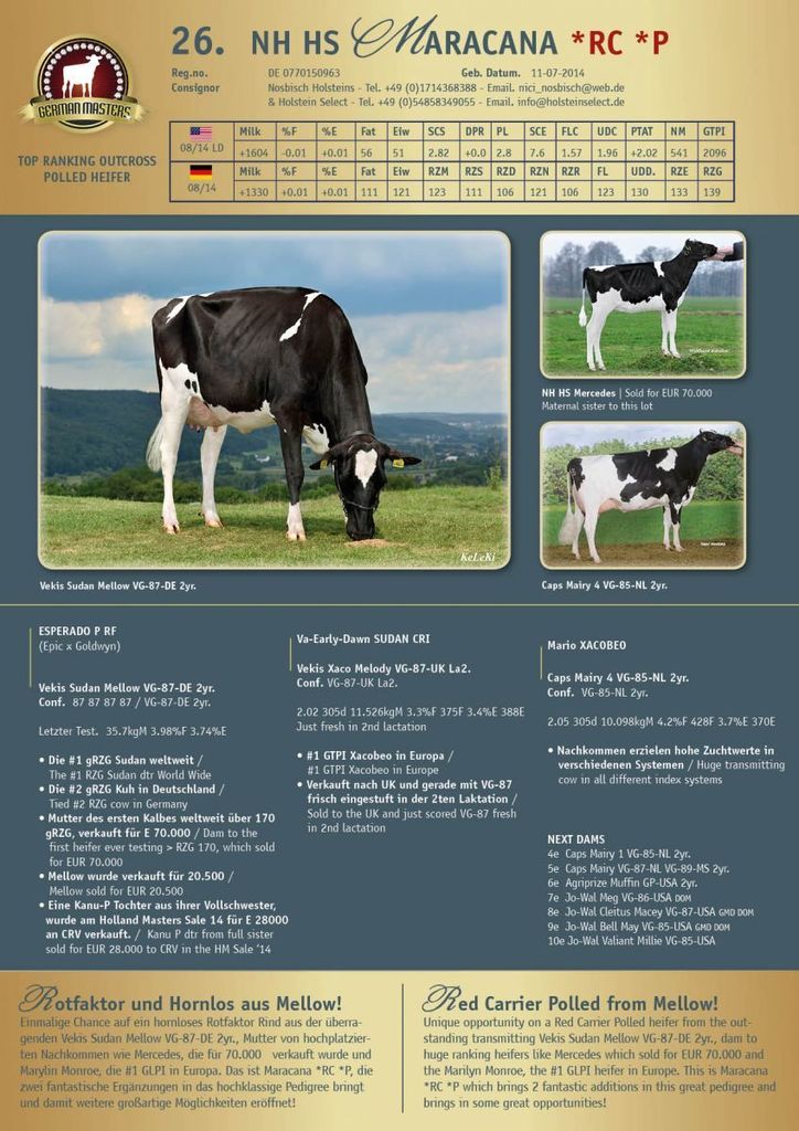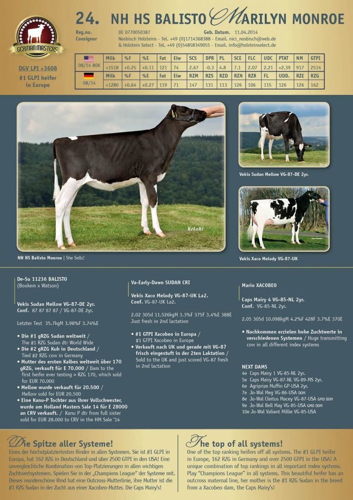 Vekis Xaco Melody is just fresh in her 2nd lactation and has raised her score to VG-87-UK with a VG-88 udder in the UK! She sold pregnant in the Vekis Spring Sale earlier this year to Shavington Holsteins in the UK. Melody is the #1 GTPI Xacobeo dtr in the World and comes straight out of Caps Mairy 4. Melody has s been a great brood cow, being dam to Vekis Sudan Mellow VG-87-DE 2yr. (#1 RZG Sudan dtr) which is dam to the first heifer ever testing over RZG 170 (NH HS Mercedes, sold for EUR 70.000) and to NH HS Balisto Marilyn Monroe, one of the highest heifers in the breed testing over 2500 GTPI, >3500 DGV LPI and over 160 RZG!