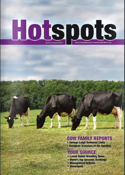 The Autumn 2013 edition of the HOTSPOTS is online! Click further for the online version with great cow family articles (Savage-Leigh Licorice & Sunnylodge Prelude Spottie), the latest global breeding news, top index rankings for bulls and females. NOTE: The subscribers will receive their Hotspots copy this week!