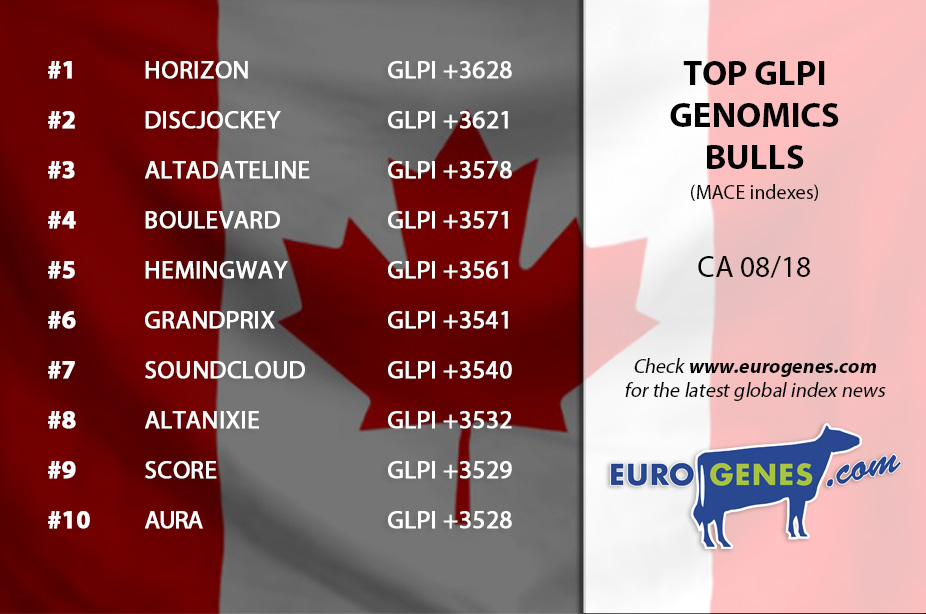 The new #1 in the genomic index on LPI is Westcoast Horizon with +3628 LPI. Followed near by Claynook Discjockey with +3621 LPI. At the third place we find an American bull: Peak Altadateline with +3578 LPI. The fourth position is taken by Westcoast Boulevard with +3571 LPI and the #5 is Progenesis Hemingway with +3561 LPI. In the daughter proven list we find Delta on the top with +3357 LPI, #2 Comestar Lautrust with +3292 LPI, #3 Glen-D-Haven Altahotrod with +3278 LPI, #4 with +3232 LPI Mapel Wood Brewmaster and the last in the top 5 is Larcrest Commander with +3223 LPI.