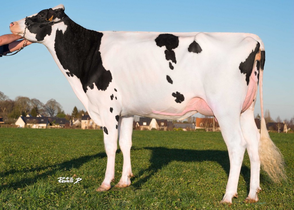 We received the NEW picture of DKR Baella (s. Monterey), she is a daughter of the huge transmitter: DKR Babylone VG-85-FR. Her IMAX son DGF BALOU is in A.I. @ Genes Diffusion and notes a very complete profil with +2771 gTPI/ A2A2/ +3.09 UDC/ 6.3% SCE/ +90 Fat! Baella her dam Babylone is the dam to the popular bulls Bolt, Brisbane, Bangalore & Baltasar. She also is the maternal sister to Baylaboy & Blacklist @ RSH. Baella her grand dam is the former #1 RZG cow in the World: DKR Bayla VG-86-NL. She deliverd several chart topping offsprings in several systems: GTPI, RZG & NVI. Bayla her dam is the former #1 GTPI cow in the World: Baviere VG-87-FR EX-MS. This Shottle daughter deliverd Jakarta @ Semex & Bossanova @ Masterrind. A great cow family which goes back on Sunnylodge Prelude Spottie VG-87-CAN 18*!! DKR Baella is a young promising cow with no less than 12 generations VG or EXCELLENT dams in a predigree!