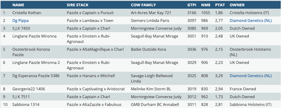 Today is it time for a great new ranking with Top 15 Siemers Rz Pazzle daughters in Europe! Pazzle is a Rozline son at +3000 GTPI in combination with +3.07 PTAT straight out of Siemers Lmda Paris EX-91-USA! The Nr. 1 Pazzle daughter in Europe is from Italy at +3166 GTPI from the Art-Acres Mar Kay 721 family. She is followed by DG Pippa at +3097 GTPI in combination with +2.77 PTAT. Making the top 3 complete with with Pazzle daughter S.J.K. 7450 at +3085 GTPI from the Morningview Converse Judy family. Remarkable in this ranking is DG Esperanza Pazzle 5386, a Pazzle daughter from the Savage-Leigh Bellwood Linda EX-USA family with a great combination of +3025 GTPI and +3.29 PTAT! This makes her the Nr. 5 female in Europe with >3020 GTPI, >550kgM, > 3.25 PTAT and >2.20 UDC!