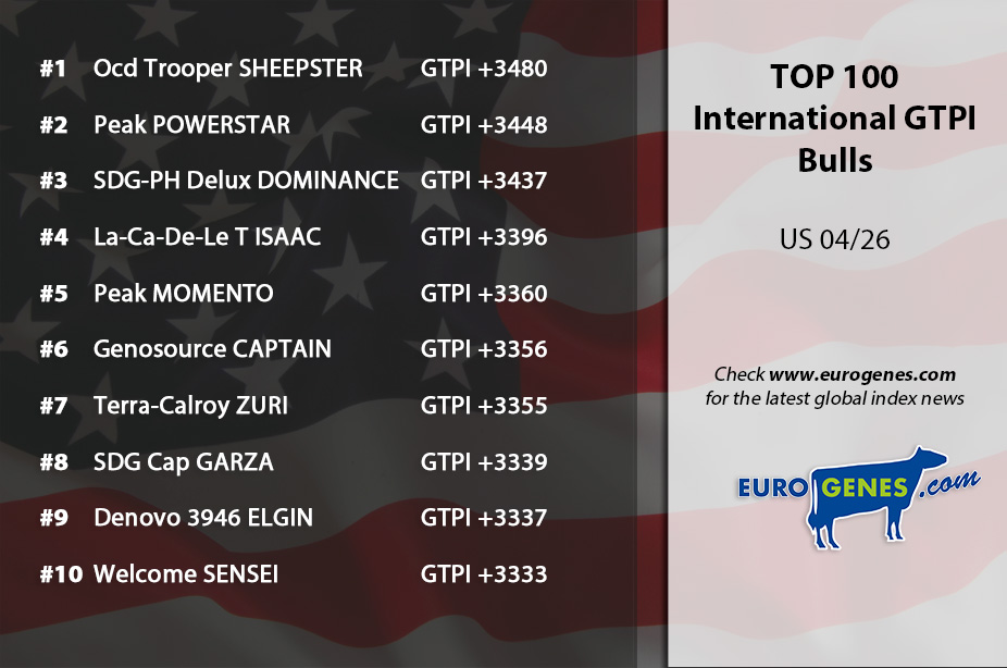 Ocd Trooper Sheepster holds the lead in the United States this week in the ranking with International GTPI bulls! He added 1915 daughters to his US-index and notes +3480 GTPI with +1359kgM, +0.28%F and +0.08%P. Also Sheepster his sons had a good proof, with for example Hi-Note at +3527 GTPI of Beyond Shpstr Golley at +3511 GTPI. New at the second spot is Peak Powerhouse, an AltaWheelhouse son with 260 daughters in his index, +3448 GTPI with +1029 NM$, +1937kgM, +0.12%F, +0.10%P and +1.1 SCE. Making the top 3 complete with SDG-PH Delux Dominance. Deluxe x Pursuit son Dominance has 804 daughters in his index, +3437 GTPI, +1303kgM, +0.29%F, +0.08%P and +1127 NM$. A great debut for Captain son Gen Percival in this ranking. He has 166 daughters in his US-index and guarantees +3202 GTPI. Percival had also a great debut in Italy with daughter proven sires, he came in as the Nr. 2 gPFT sire!