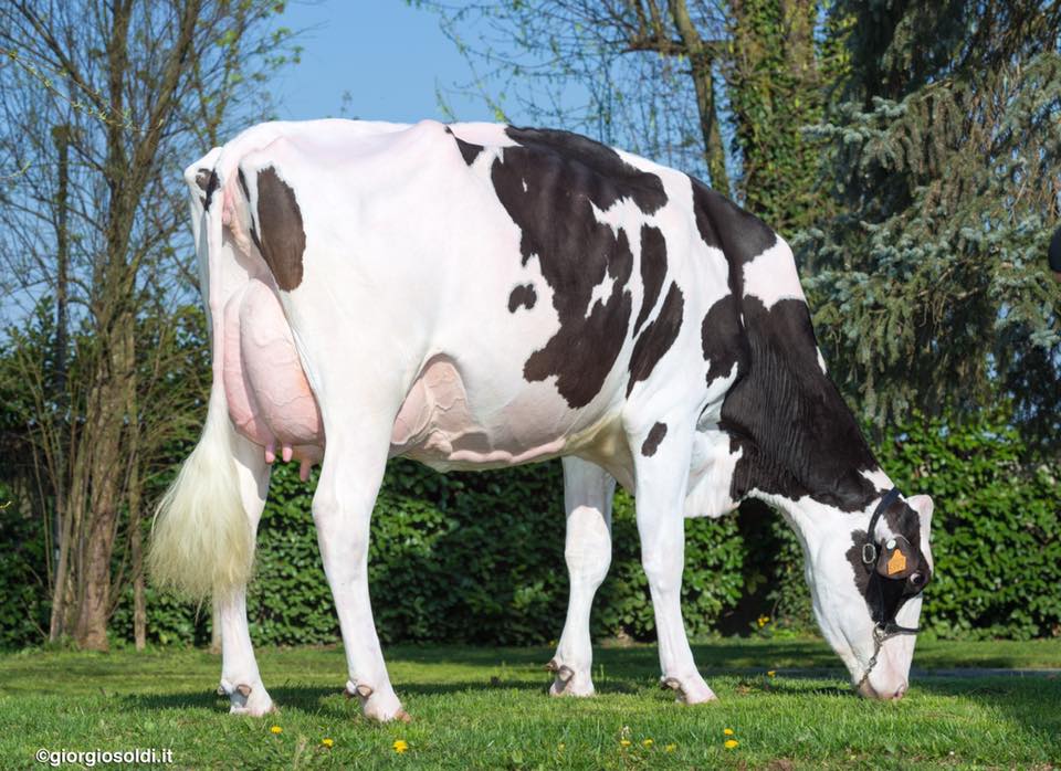 All.Nure Numero Uno Pepita is fresh in her 2nd lactation and has recently raised her score up to 89 points with an Excellent Mammary System! Pepita was the topseller of the Holland Masters Sale 2012 and proved herself as a great brood cow, as dam of DG Popstar (GTPI +2608 / gPFT +3799) and she had a Kingboy dtr which tested +3.22 PTAT in combination with >2500 GTPI. Click further for some new pictures of All.Nure Numero Uno Pepita @ Allevamenti Al.Be.Ro in Italy.