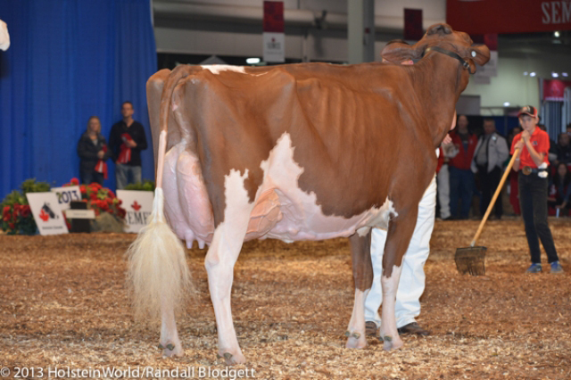 BTS Apple-Red, owned by GAEC Du Bontemps, is a fancy Durham Red grand daughter of THE RED cow of this moment, KHW Regiment Apple Red EX-95-USA. Apple was Res. Grand Champion R&W at the World Dairy Expo 2013 while her clone was Grand Champion R&W and her Talent dtr was HM Grand, this Talent dtr won the Reserve Grand Championship last week at the Royal Winter Fair for R&W. A full sister to this Talent is the mother to BTS Apple-Red.