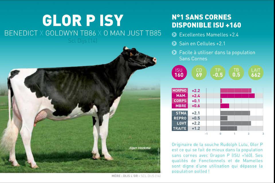 The French breeder SCL Dijs has developed a very interesting branch of the Canadian Delaberge Durham Lucille cow family. Lucille is the grand dam to Delaberge Pepper @ Genervations, the hot Mogul son at this moment with over 2500 GTPI. This family produced already proven sires like Shocker @ Semex and Etazon Dijs Sunchyme, the former #5 gNVI bull in the Netherlands. Now it is the turn for the Polled Benedict son, Glor P ISY, which is the #1 POLLED bull in France with +160 gISU and +2.2 for Conformation.