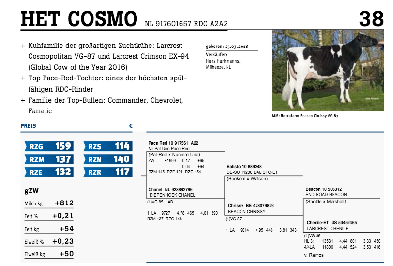 Hurkmans ET has offered the very best for the upcoming Highlightsale this Friday in Hamm, Germany. It's HET Cosmo a Pace-Red daughter with +159 RZG, +132 RZE, RED CARRIER, +337 gNVI and she is ready to flush! This fancy heifer is a daughter of Diepenhoek Chanel VG-85-NL and traces back to Larcrest Oside Champagne EX-90-USA. This family delivered the huge transmitters Larcrest Cosmopolitan VG-87-USA and Larcrest Crimson EX-94-USA. Also the well-known sires Commander, Chevrolet, Fanatic, Cancun and O-Cosmopolitan are from this stunning family. HET Cosmo also guarentees high components in her index: +0,21% Fat and +0,23% Protein in her German index. So make sure you bid last on this great heifer, selling this Friday!