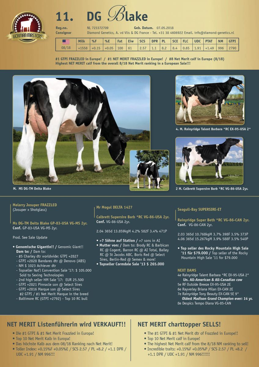 Lot 11. DG Blake sells in absentee in the German Masters Sale on Friday, October the 19th - she is a spectacular lot, she is the #1 GTPI and #1 Net Merit FRAZZLED dtr in the European rankings, she is a Top 10 Net Merit calf in the overall European ranking and has a stunning pedigree! Click further for her barn snapshot picture and more information!