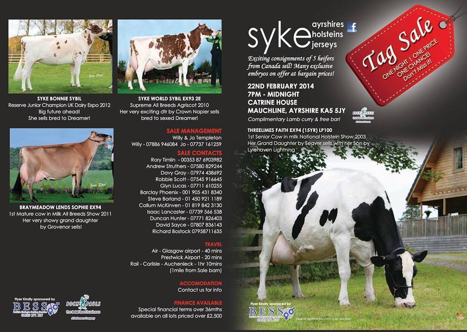This Saturday the 22nd of Febraury the Syke Tag Sale will take place at the farm of Syke Holsteins in Scotland. Multiple exciting Holstein & Jersey consignments including 5 heifers from Canada sells and many exclusive packages of embryos! Click further for more information.