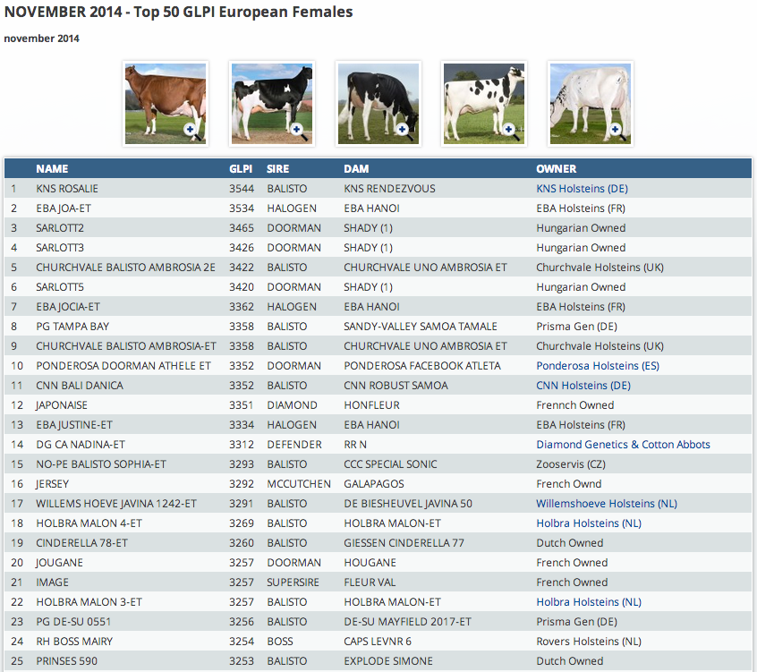KNS Holsteins (Niermann, Schiplage) has the #1 position in the European November 2014 run for GLPI Females. KNS Rosalie is a Balisto daughter out of KNS Rendezvous with GLPI +3544. Click further to see the entire Top 50 GLPI.
