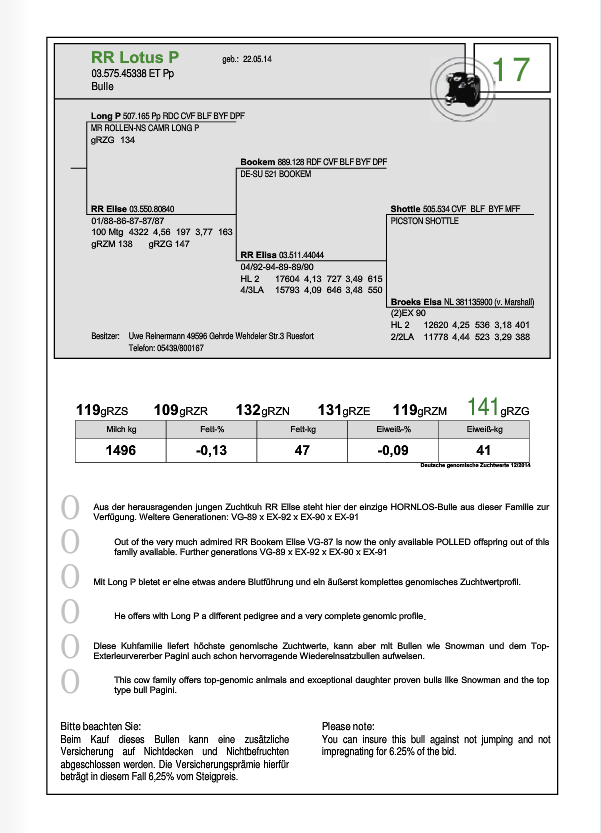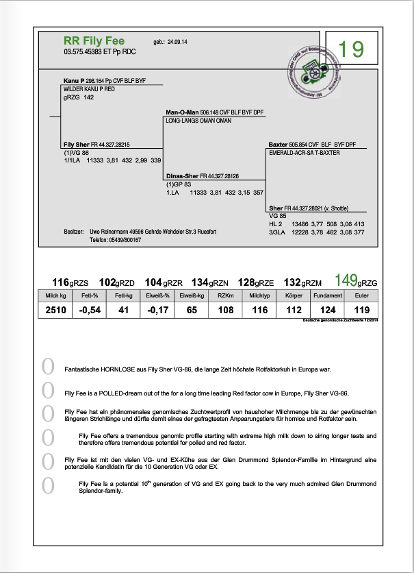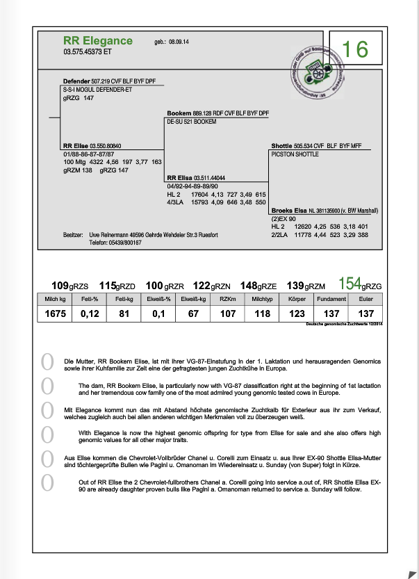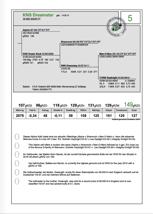 The OHG Top Genetik Auktion will take place this Saturday on the 31st of January during the Osnabrücker Schwarzbunt-Tage in Osnabrück, Germany. Some great calves are selling by the Eurogenes members KNS Holsteins and Zuchtbetrieb Reinermann like an Alpine from the Dreamday family with EUR 5.600 worth in embryo contracts, a Defender from the Elsa's with 154 RZG and almost 2500 GTPI and >23.000 Euro in embryo contracts, an RZG 149 Polled RC Kanu P from the Splendor's with EUR 13.600 in embryocontracts and more! Click further for more information, pedigrees and the contract update.