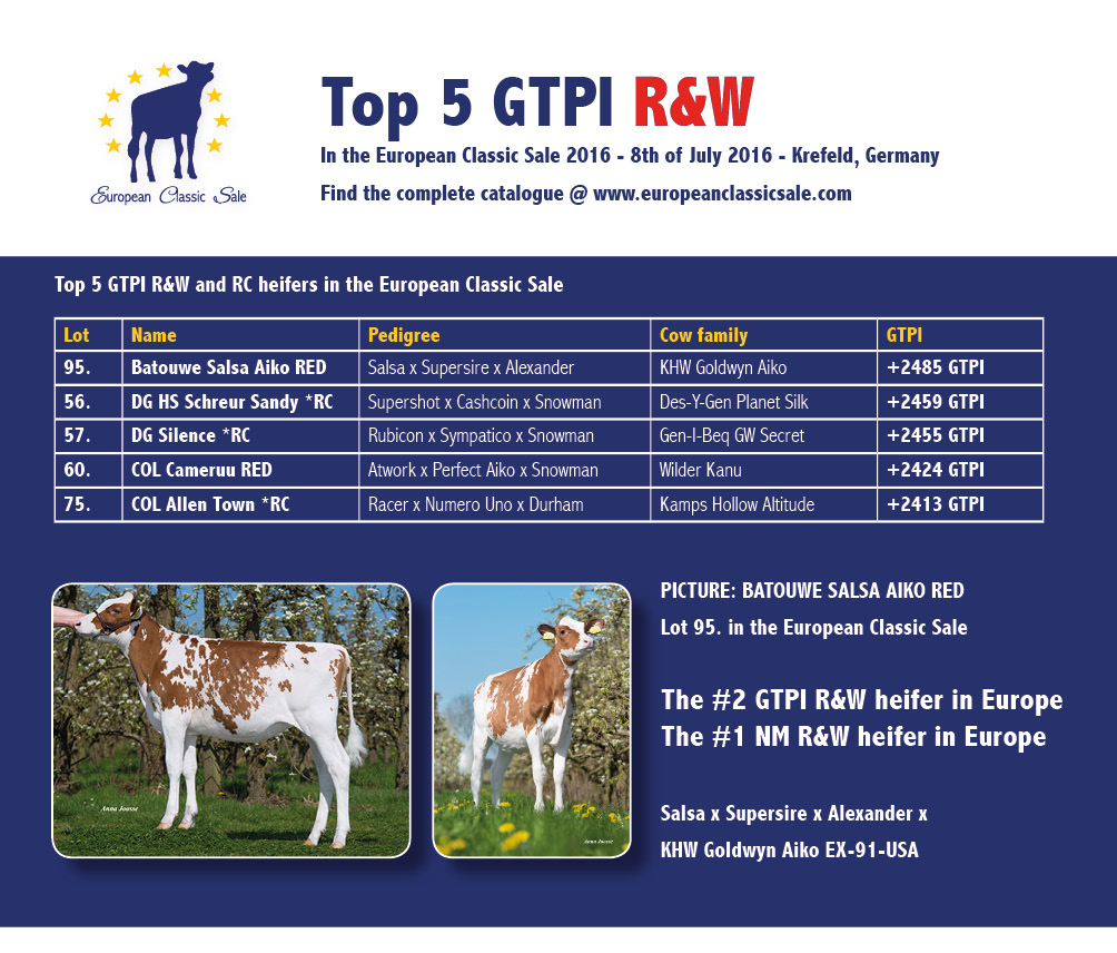 Find here the Top 5 of R&W and RED CARRIER GTPI heifers selling this Friday in the European Classic Sale. Including Europe's #2 GTPI R&W heifer and #1 for Net Merit, going back on KHW Goldwyn Aiko EX-91-USA!!