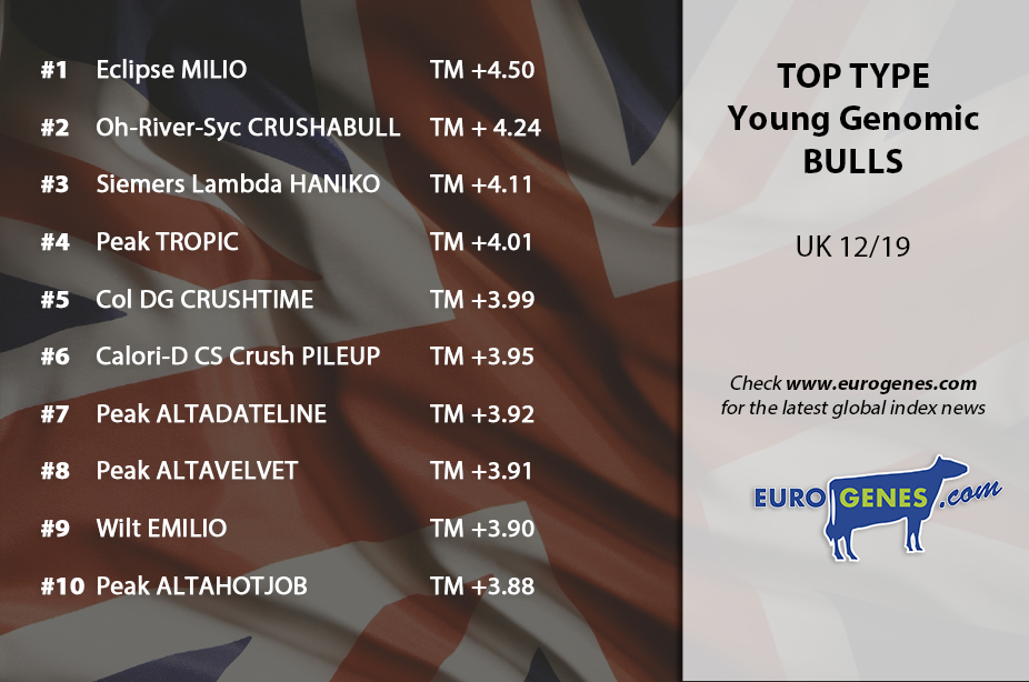 The indexes of United Kingdom are ONLINE now!! With Bomaz Fynn as the brand new PLI bull with +878 PLI £ in the top genomic young bulls list. He is followed by Denovo 14566 Crosby at place 2 with +871 PLI £ and Melarry Frazz Arrowhead closely followed at place 3 with +870 PLI £. The #1 PLI daughter proven bull is this run Bomaz AltaTopshot with +788 PLI £ far ahead of the second one in the list View-Home Littlerock with +749 PLI £. The TYPE leader in the UK is Eclipse MILIO with +4.50 TM. Also in the top 10 TYPE bulls in UK are Siemers Lambda HANIKO, +4.11 TM at place 3 and Col DG CRUSHTIME with +3.99 TM at place 5.