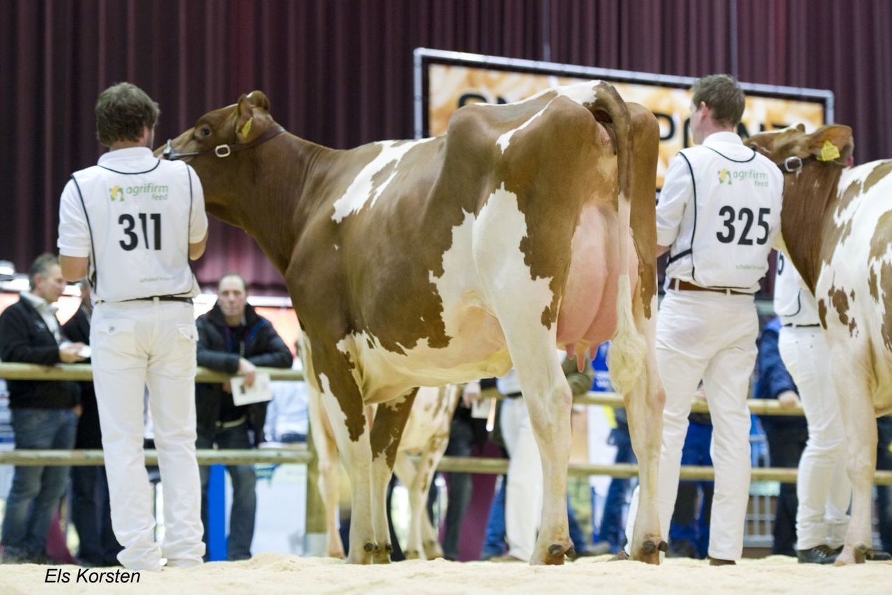 Molenkamp Anky 6, a daughter of the home bred bull Molenkamp Andy x Grietje family recently scored VG-88-NL with a Maximum score for her Mammary System! Anky 6 was shown at the National HHH Show, last December where she was with the final 5 cows in the R&W 2yr. Old class. Her mother is Molenkamp Anky 2-Red VG-85-NL 2yr. a heavily contracted cow for many AI's from Netherlands and Germany and already has several sons in AI.