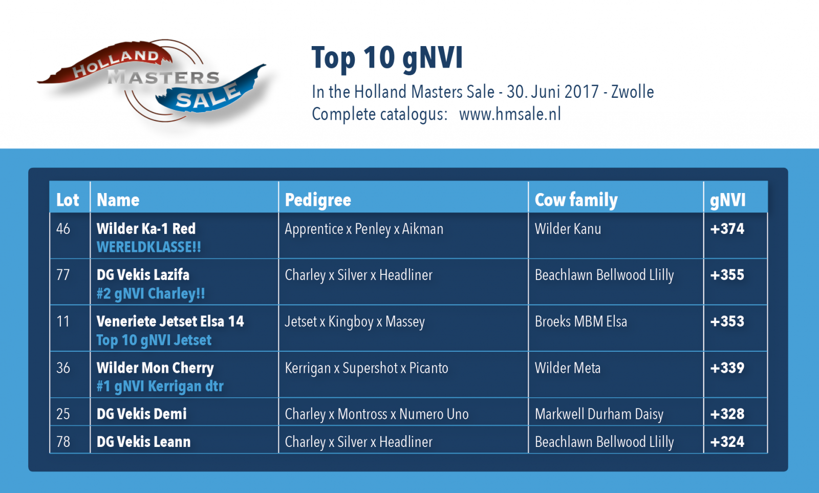 The Holland Masters Sale, the sale during the Dutch National show which offers the World's very highest ranking heifers in differen test systems. With also the World's highest ranking heifers for the Dutch gNVI systems, including the World's #3 gNVI R&W heifer, the #1 Kerrigan dtr, the #2 Charley dtr and more! Click further for the complete ranking.