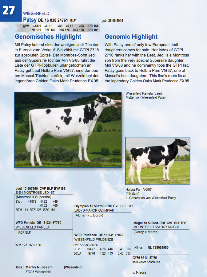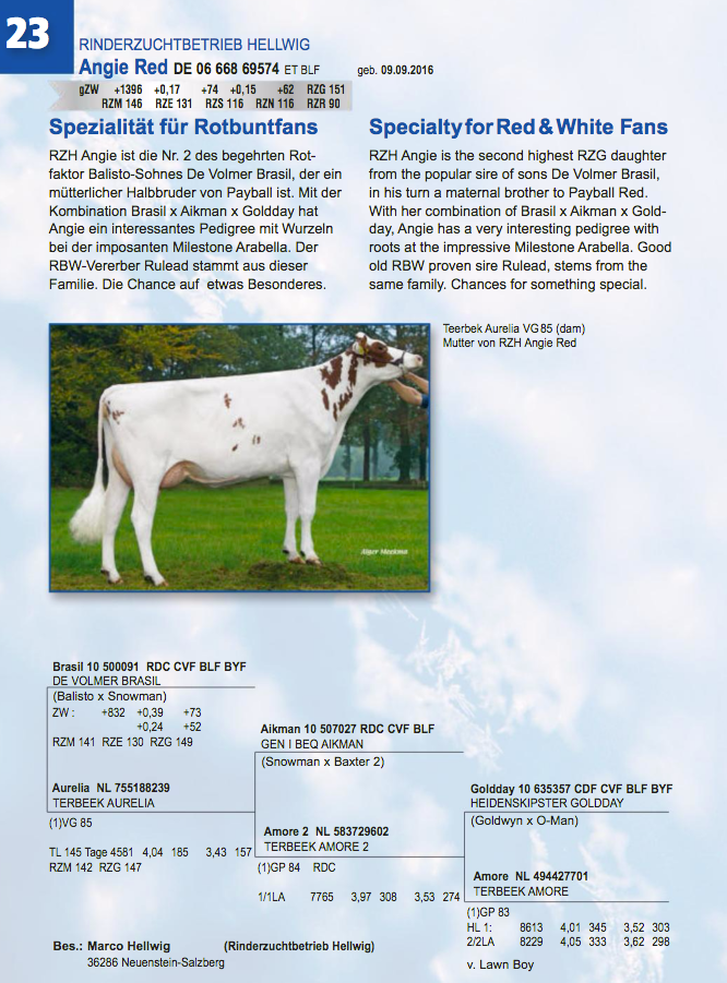 The annual Zukunft Rind Show and Auktion in Hessen, Alsfeld, Germany will be held this Saturday. Rinderzucht Hellwig and Wiesenfeld Holsteins have some great consignments in the sale including: RZH Entitle Lambada, a +150 RZG red Entitle dtr out of the family of Tiger-Lily Ladd P-Red and Wiesenfeld Patsy who is an early Jedi daughter with RZG +154 & +132 Type out of the Holbra Prudence cow family. Click further for more info.